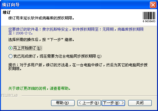 蓝字部分显示要续订的软件以及软件和病毒库的授权期限,请确认无误后再进行下一步操作。如果从未进行过续订,而且现在需要续订,则选择“马上开始续订”选项,然后按“下一步”继续,请参考 续订。