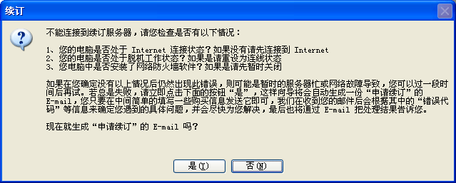 - 可能是我们的服务器暂时发生了故障,如果是这种情况您可以隔一段时间(30-60分钟)后再试试,因为一般服务器出现问题后可在一段时间后恢复。如果一直不行则可以点击上面对话框中的“是”来进行“E-mail申请续订”,请参考“如何用 E-mail 申请续订”