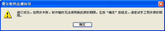 出现此情况表示续订后新的授权期限已经成功的保存在我们的中央服务器,但没有成功的下载到本机,所以本机暂时无法使用新的授权期限。您可以按“确定”,程序会自动切换到“同步授权期限”的画面,然后继续尝试同步授权期限的操作。