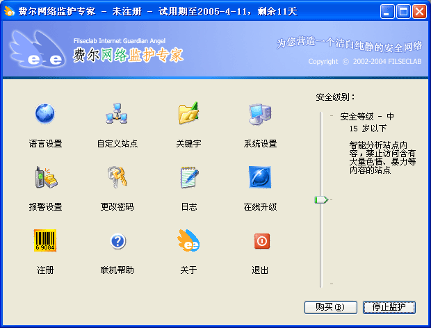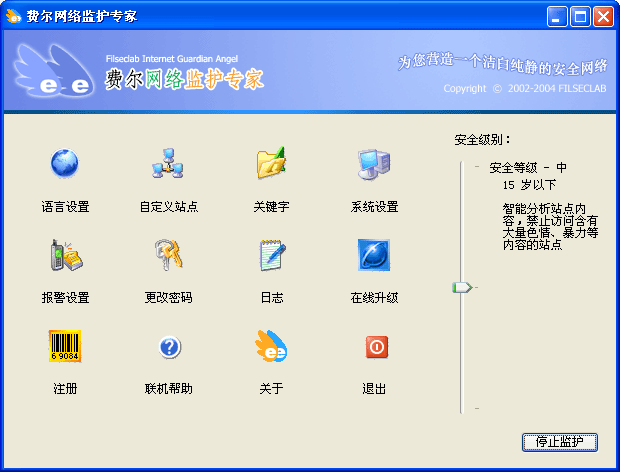 用户认证 启动/停止监护 安全等级 语言设置 自定义站点 自定义关键字 系统设置 报警设置 更改密码 日志 在线升级 注册 关于