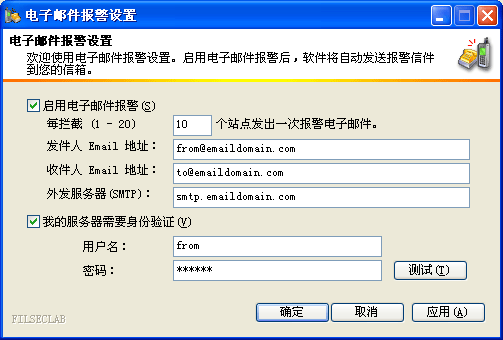 目前 费尔网络监护专家 支持使用 E-mail 报警。当被拒绝的站点达到一定的数目时就会自动向指定的信箱发送一封报警信件。信件内容包含被拒绝的网址。