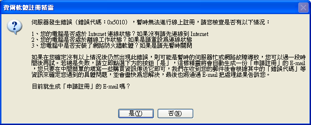 - 可能是我們的註冊伺服器暫時發生了故障,如果是這種情況您可以隔一段時間(30-60分鐘)後再試試,因為一般伺服器出現問題後可在一段時間後還原。如果一直不行則可以點選上面對話框中的「是」來進行「Email申請註冊」。有關方法請參考「申請註冊的方法」