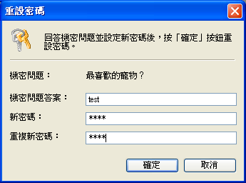 在設定機密問題後,可以在忘記密碼的時候利用回答機密問題來重設密碼。在此對話框中輸入 機密問題答案,然後設定一個新的密碼,按確定按鈕即可。