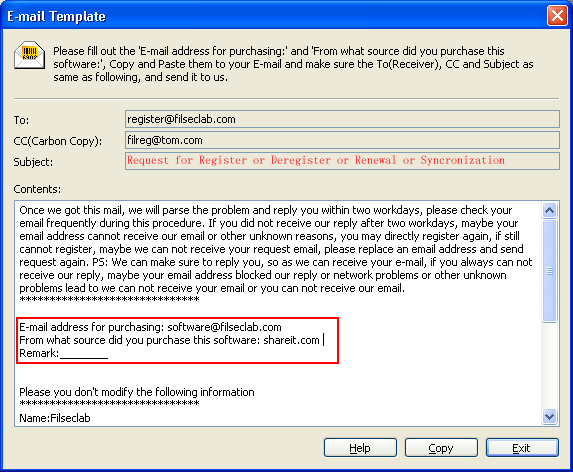 You need to fill out the "E-mail address for purchasing" and "From what source did you purchase this software", you may also fill out the remark if you have. NOTE: Please you don't modify the other information !!