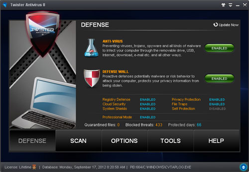 What's Twister AntivirusThe different, amazing, intelligent anti-virus software. Lasted five years carefully crafted new generation anti-virus software. It integrates almost all of top class security technology such as Proactive Defense, Virtual Machine, Heuristic, iGene, Blackbox, Rollback and Cloud Security etc. It has unparalleled defense capability to against Viruses, Trojans, Spyware and other all kinds of threats. Precise rollback brings amazing clean ability. Multimedia animation interface and speech control gives you a different experience. Features