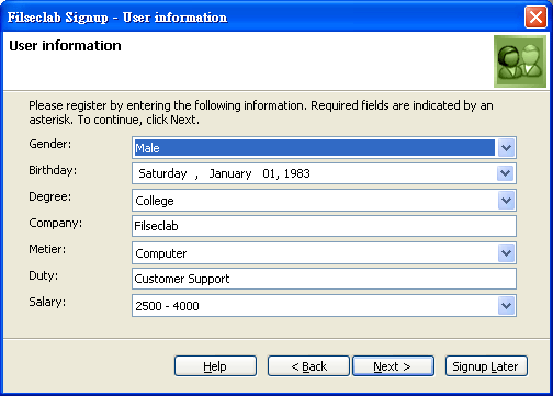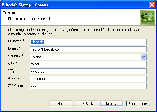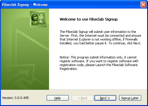 1. Open Filseclab Signup program from Start -> Programs -> Filseclab -> Filseclab Signup. The frame as following.