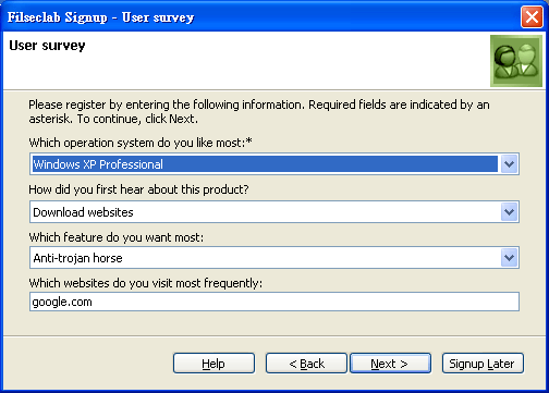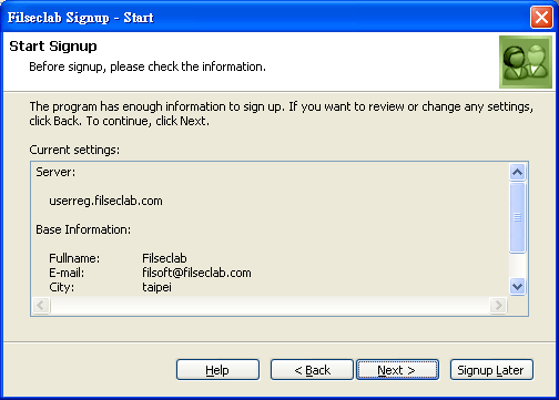 You may set signup server in this frame, the default userreg.filseclab.com is recommended, if it cannot be connected, you may try www.filseclab.com, or visit our website at http://www.filseclab.com to view that whether it have some changes.