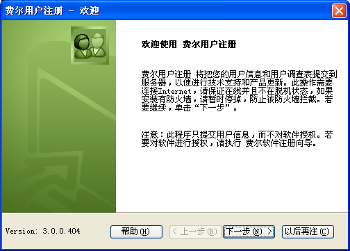 用户注册 和 软件注册 有着根本的区别。用户注册是用来提交用户信息和进行用户调查的程序,它用来表明您使用了费尔列软件。而软件注册,是使用注册码对软件进行注册,注册后的软件将从试用版变成正式版。用户注册是不能注册软件的。